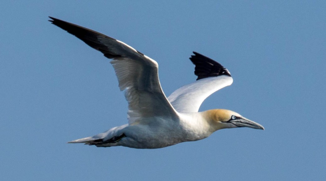 When crossing the Channel and sailing in Britanny, quite often we encountered the northern gannet (Basstölpel, Morus bassanus) far away from land. It is native to the coasts of the Atlantic Ocean and breeding in Western Europe. They search for food during the day, generally by diving at high speed into the sea. Birds that are feeding young have been recorded searching for food up to 320 km from their nest. They dive for fish from between 11 and 60 m. (see https://en.wikipedia.org/wiki/Northern_gannet)