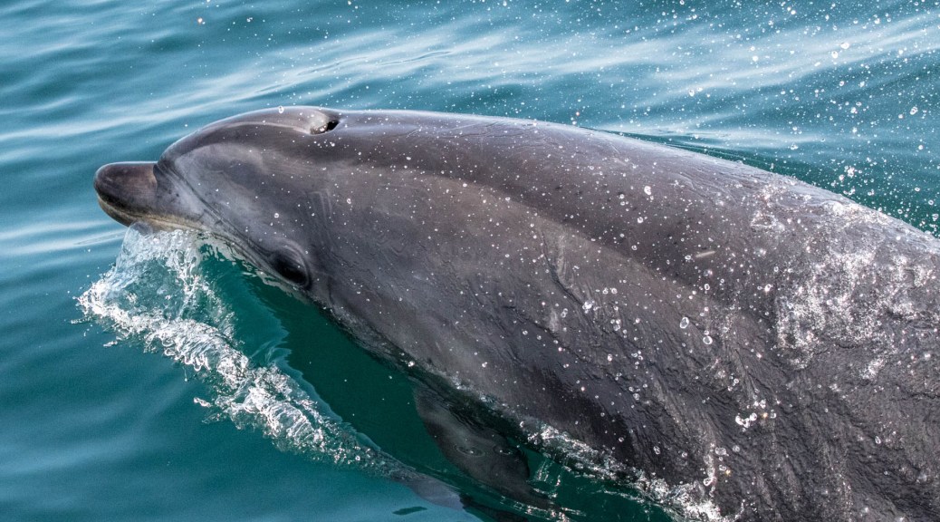 A school of maybe twenty bottlenose dolphins (großer Tümmler) in the Channel between England and France near the coast of the Normandy. The family with young and old animals enjoys swimming with the boat.