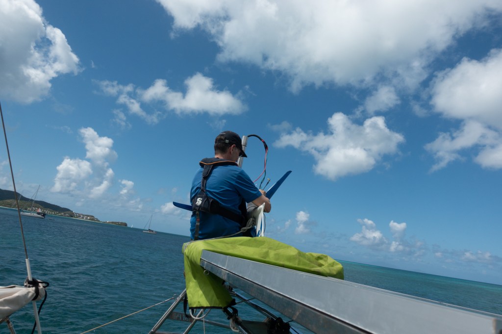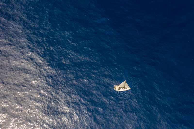 Good wind the first two days (3 to 5 Bft.), but no wind the last few hours (picture). Not enough even for our light-wind sail, the Gennaker. Excellent food from Markus (rice salad), his jokes, flying the drone and an optimistic wind prediction help to keep spirits up.