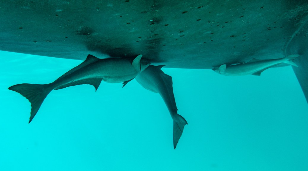 Normaly they suck on whales or sharks, but ocasionally on ships: Ramora (Schiffshalter). I hoped they would clean our underwater ship before transatlantic crossing, but I’m not shure they were effective ;-). Barbuda seems to be a place where ramora are seen quite often by sailores, as at the beach north of cocoa point.
