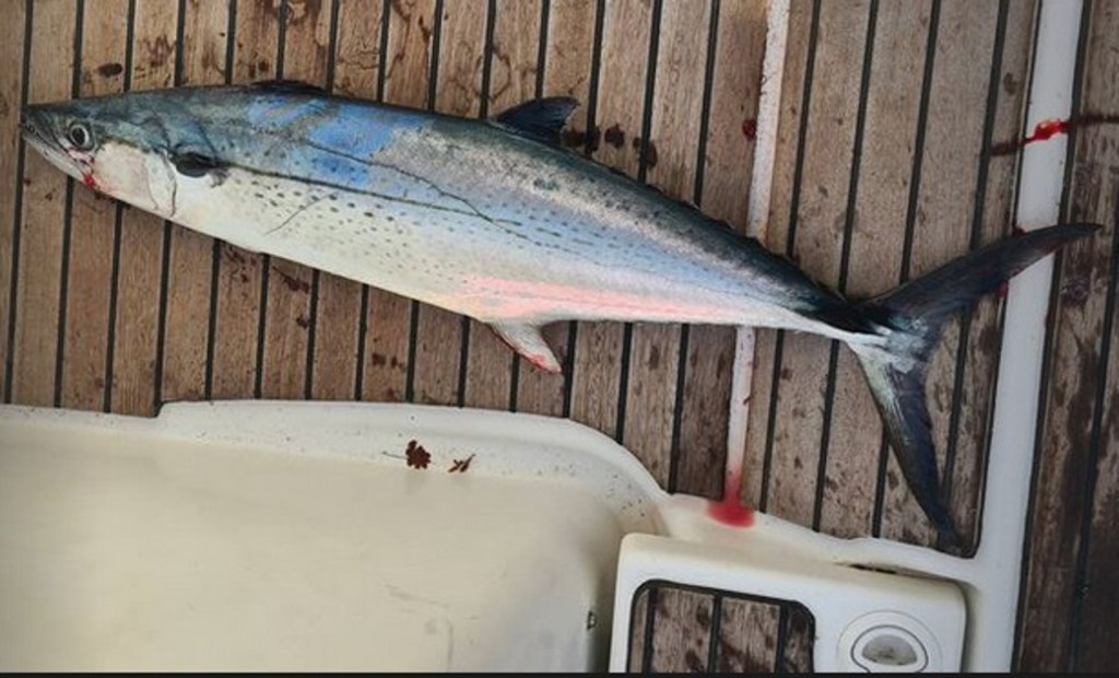 First, we noticed that the better part of our squid lure (Tintenfischköder) was bite away. Second, a Wahoo tried to catch the new lure that we replaced, but missed it and instead jumped out of the water (when they hunt they are as fast as 80 kilometers an hour). Third, we caught a 7 kilogram Wahoo, just before sunset.