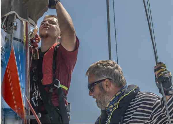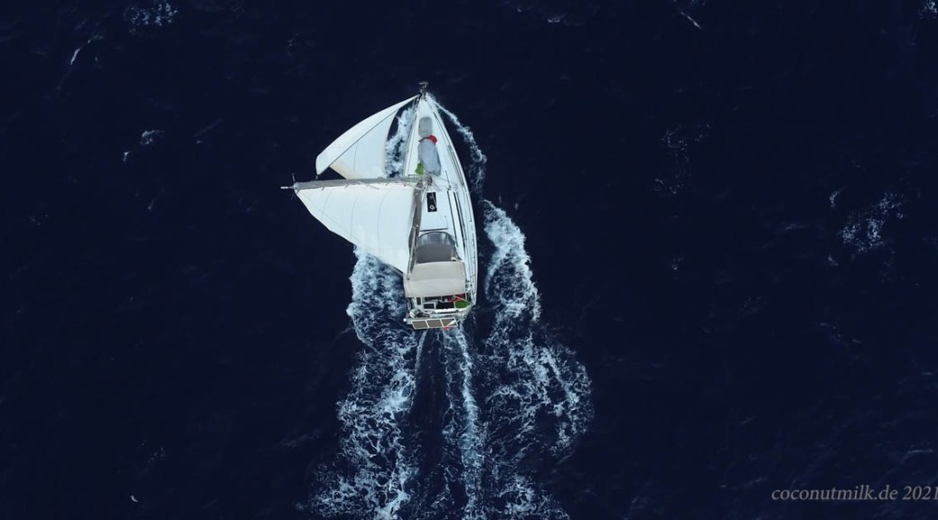 Not far away from the ill-reputed Bermuda triangle, where things tend to disappear without any trace, in the deepest night, deckhand Markus looks up from the helm (Steuerrad) to check our light wind sail Gennaker. It’s gone. He looks into the stars where once the 110 sqm sail had been. The sail had stopped flying and started swimming and then diving without giving notice. A chafed Halyard (durchgescheuertes Fall zum Hochziehen des Segels) was the culprit (Übeltäter). After a short moment of confusion the crew of three managed to catch the sail and to pull it on board. This happened three days ago, and the sail is flying again.