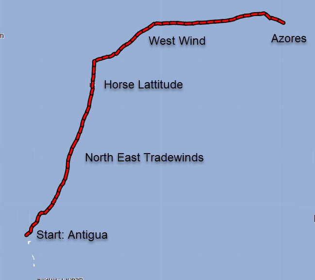 Our sailing route from Antigua to the Azores was determined by wind and followed the classical approach. First, we sailed N (North) or NNE (North North East) close haul (dicht am Wind) against the E or NE trade wind. Then, for two days, we used the engine to cross the calm Horse Latitudes. Therafter we nicely connected to the westerly winds that there prevail and sailed East, reaching (vor dem Wind), to the Azores. Two days later, the same strategy would have lead us into a storm. Thanks to our friend Ivan, who informed us with weather routing, for the last 2000 miles we had a safe and fast trip so far.