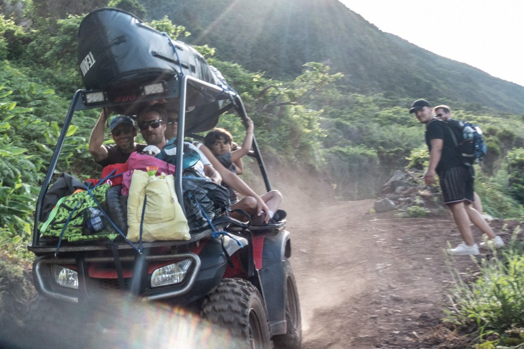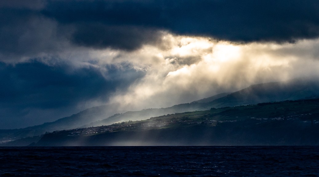140 Seemeilen mit Groß- und Vorsegel bei gutem Wind entlang der Inseln der Azoren, entlang der wolkenverhangenen Vulkane, an deren Füßen Siedlungen – Fajas – liegen. Dann abnehmender Wind: das Leichtwindsegel Gennaker verdrillt sich beim Setzen und schlägt danach nervenzermürbend vor dem lauen Wind. Stärkerer Wind soll nur wenige Motorstunden entfernt sein. Unser Ziel ist Osten, doch eine Windprognose weißt nach Norden, eine andere nach Süden.