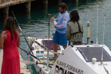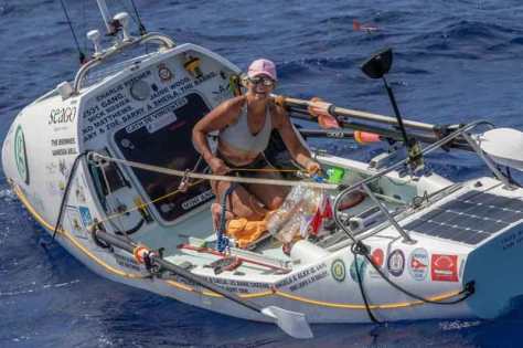 to look out. But even one mile away we saw nothing. VHF radio contact now verified that it was “a rowing boat with two oars (Ruder)” and one woman on board. After establishing that rescue was not asked for, we offered tuna and mahi mahi steaks. However, Jona opted for fresh fruits and cheese. Thus, some of our last apples, oranges and lemons were gone… but happily so, as we were proud to help such a great woman to achieve her unbelievable goal: to reach Barbedos in one week, after seven weeks on the ocean – in a rowing boat.
