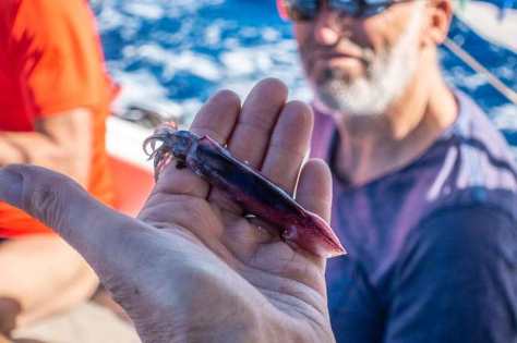 We are getting used to flying fishes that hit our boat. We consider them too small to eat. If they don’t themselves jump back into the sea we put them there. But we were quite astonished when five small squids (Tintenfische) simultaneously hit our boat. Probably they mistook Orinoco or our fishing lures for a predator like a Mahi Mahi or a Tuna. One squid landed next to the kitchen inside the boat. As it didn’t land inside the cooking pan, we also put it back into the ocean.