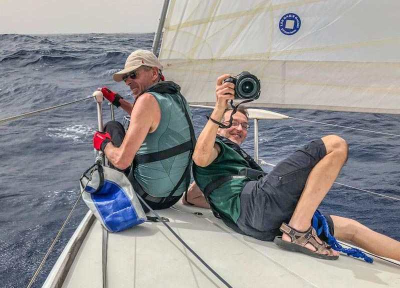 Watching dolphins, reading books and viewing downloaded netflix videos – that’ what we thought the transatlantic passage would offer. However, the reality is otherwise: 24 hours a day the course and security of the ship has to be managed, in the nighttime by two people. Jibing (Halsen) and reefing (Reffen) is work for three people, and for more in bad weather conditions. Navigation has to be planed and weather data to be obtained and discussed. Fresh food has to be prepared, toilets to be cleaned. Repairs have to be done (our saloon table was broken by a falling crewmember in high waves, thank’s to God no harm to the sailor). And skipper Fred’s theoretical and practical security briefings and workshops every day are mandatory. The passage is demanding, but nevertheless great fun and for most of us a once in a lifetime event.