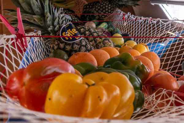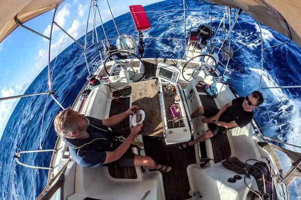 Wurde die ersten Tage noch ein Menü-Vorschlag besprochen und gekocht, so wich diese schnell dem System: es kommt auf den Tisch was reif ist. Dabei hilft unser ausgeklügeltes „Proviant-Management”. Aus dem Aufbewahrungsnetz wandert das reife, manchmal auch überreife Obst in das Verbrauchsnetz. Zuständig hierfür ist Proviantmeister Finn. Damit stehen die Hauptbestandteile für die Zwischenmahlzeit und das Abendessen fest. Nach nunmehr 10 Tagen auf See kann man sagen, dass wir erstaunlich wenig wegwerfen mussten. Doch die nächsten Tage werden wir unseren Essenplan wieder umstellen müssen. Frischware Ende. Aber keine Bange, auch dann haben wir noch leckere Sachen auf dem Plan ….. (Gastbeitrag Markus)