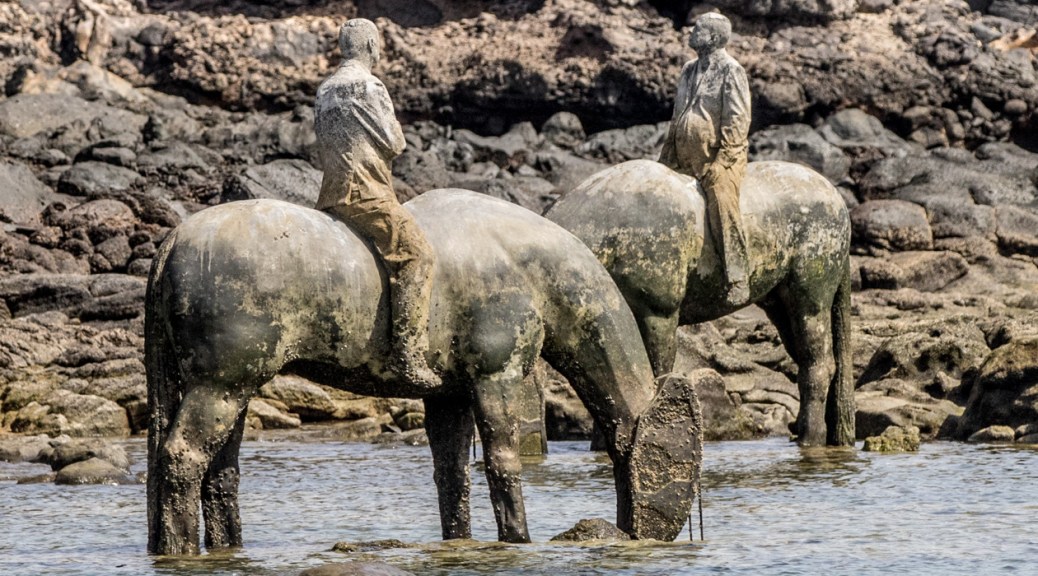 In the intertidal zone in the port of Arrecife, at low tide, we noticed this temporarily installed sculpture by Jason de Caires Taylor. ”The Rising Tide is a sculpture depicting four riders on their saddles, horses whose heads are oil drilling pumps, reflecting the great threat that hangs over the planet and especially on the seas and Oceans” (Centers for Arts, Culture and Tourism (CACT), Link)